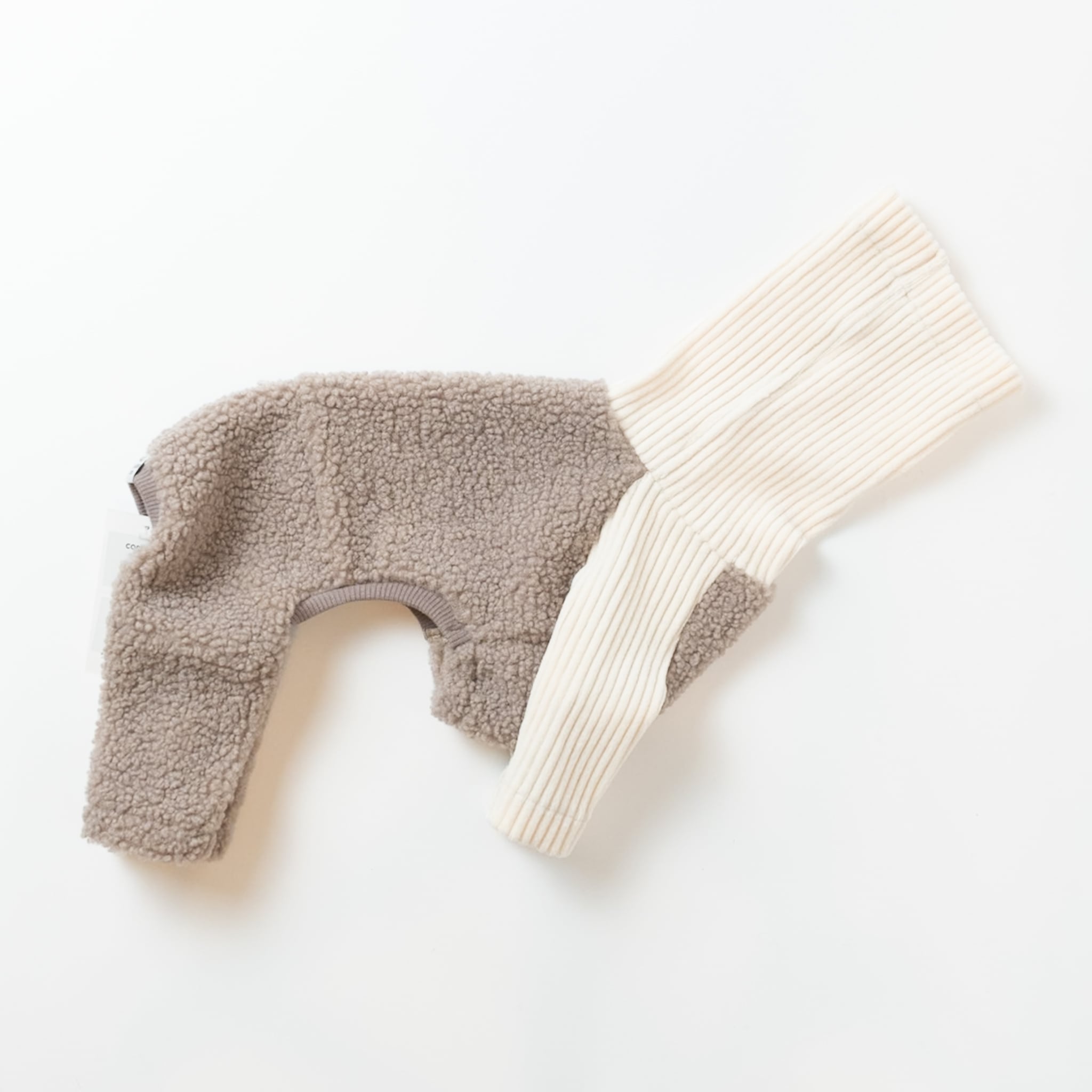 あたたかいボア生地とコーデュロイ風ニットを組み合わせたら、ワンダードッグらしいかわいいロンパースができました。